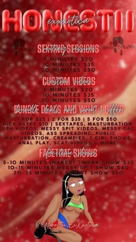 I'm so glad you found me💦 What is that dirty mind of yours thinking🍬 🤔 I'd love to help you out. But you have to use your words 🍬 tell me what you want🍬 💦 Always fetish/kink friendly so don't be afraid to ask. 💦 I offer a whole list of things so tell me what that lovely brain of yours is thinking. 🍬 Or simply ask for a menu. 🍬 Customs are my absolute favorite thing so let your imagination run wild. I LOVEE to Make this FAT PUSSY CUMM💦 List of VIDEOS you can buy 🔻🔻🔻 💦 Squirting 🦶🏾Feet 🍆Joi 🤣Sph ⭐ Anal 😲 Deepthroat CONTENT AVAILBABLE 24/7! 💙 SUBSCRIBE TO MY ONLYFANS 🫣 Follow My Insta🍒 Cum See My Naughty Side ⬇ 🫦 S SUBSCRIBE TO MY ONLYFANS 🫣 🔗 LINKS https://onlyfans.com/honestii_exxxotica Twitter @downsouthvixiin IG @honesti_exxotica Ft shows, Sexting, Feet Fetishes , B/G Content , Customs & More! Ask For My Content Menu Love💋 ✨ IG:honesti_exxotica TWITTER :@downsouthvixiin Telegram t.me/honestiexxxoticafree